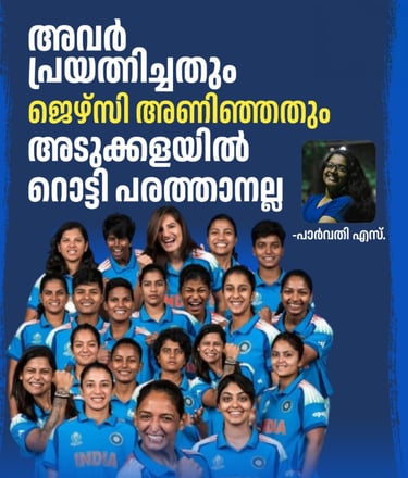 എതിർ ടീമുകളെ ഭയപ്പെടുത്തുന്ന, ഗാലറി കടന്നു പോകുന്ന സിക്സറുകൾ പായിക്കുന്ന ഇരുപത്തിരണ്ട് കാരി റിച്ച, പാഞ്ഞു വരുന്ന പന്തുകളെ ഏത് ദിശയിലേക്കും പായിച്ച് ബൗണ്ടറികൾ കടത്താൻ കഴിയുന്ന ജെമീമയും ദീപ്തിയും, അരങ്ങേറ്റം കുറിച്ച നാൾ മുതൽ ഏറ്റവും ശാന്തമായി കളിയുടെ അവസാന പന്തുകൾ വിജയലക്ഷ്യത്തിലേക്ക് പായിക്കുന്ന അമൻ,.. ഇവരെല്ലാം ഇന്ത്യൻ ക്രിക്കറ്റ് ടീമിന്റെ ഭാഗമാണ്. അവരെ തിരിച്ചറിയാനും അവരെ ഓർക്കാനും ഒരു 2017 ലോക കപ്പിൽ ഹർമൻപ്രീത് നേടുന്ന 171 റൺസോ, കോഹ്ലിയുടെ റെക്കോർഡുകൾക്കൊപ്പം ചേർത്ത് വെക്കാൻ വേണ്ടി മാത്രം സ്മരിക്കപ്പെടുന്ന സ്മൃതിയുടെ പതിനെട്ടാം നമ്പർ ജേഴ്സിയോ, സെമിഫൈനലിൽ ഇന്ത്യയെ ജയിപ്പിച്ച ജമീമയെ പ്രകീർത്തിച്ച് ഇടുന്ന പോസ്റ്റുകളോ മാത്രമല്ല വേണ്ടത്. അവരെ അവരായി അംഗീകരിക്കുകയാണ് വേണ്ടത്. അവർ ചെയ്യുന്ന ജോലിയിൽ അവരുടെ പുരുഷ ടീമിന് കിട്ടുന്ന അതേ ബഹുമാനവും ആദരവും ലഭിച്ചില്ലെങ്കിലും സമൂഹ മാധ്യമങ്ങളിൽ അവർ നേരിടേണ്ടി വരുന്ന ഒരു ആക്രമണവും അവർ അർഹിക്കുന്നതല്ല.